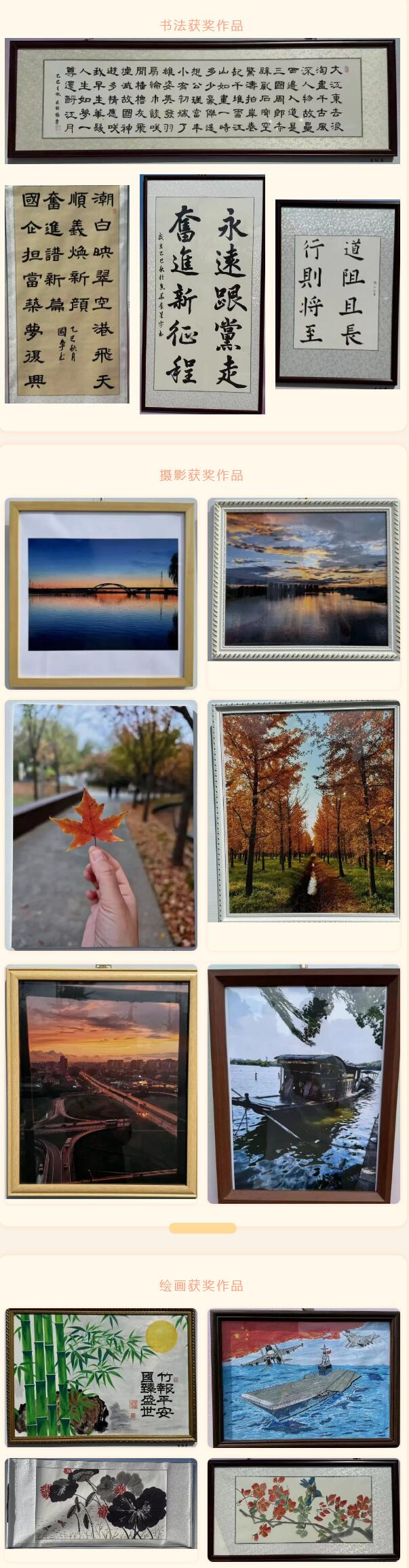 活動(dòng)現(xiàn)場(chǎng)布置井然有序,50余幅攝影、繪畫、書法作品集中展示,題材豐富、形式多樣。參展作品緊扣“賀華誕、繪盛世”主題,聚焦新時(shí)代發(fā)展成就,展現(xiàn)順義建投責(zé)任擔(dān)當(dāng),講述“青鋒英才奮斗故事”,兼具思想性與藝術(shù)性,充分展現(xiàn)了順義建投干部職工積極向上的精神風(fēng)貌。展覽活動(dòng)現(xiàn)場(chǎng),參展人員認(rèn)真觀展,依據(jù)評(píng)選規(guī)則進(jìn)行投票,最終評(píng)選出一等獎(jiǎng)3名、二等獎(jiǎng)5名、三等獎(jiǎng)6名。公司領(lǐng)導(dǎo)為獲獎(jiǎng)作者頒發(fā)榮譽(yù)證書,對(duì)其優(yōu)秀創(chuàng)作成果予以表彰。書法獲獎(jiǎng)作品攝影獲獎(jiǎng)作品