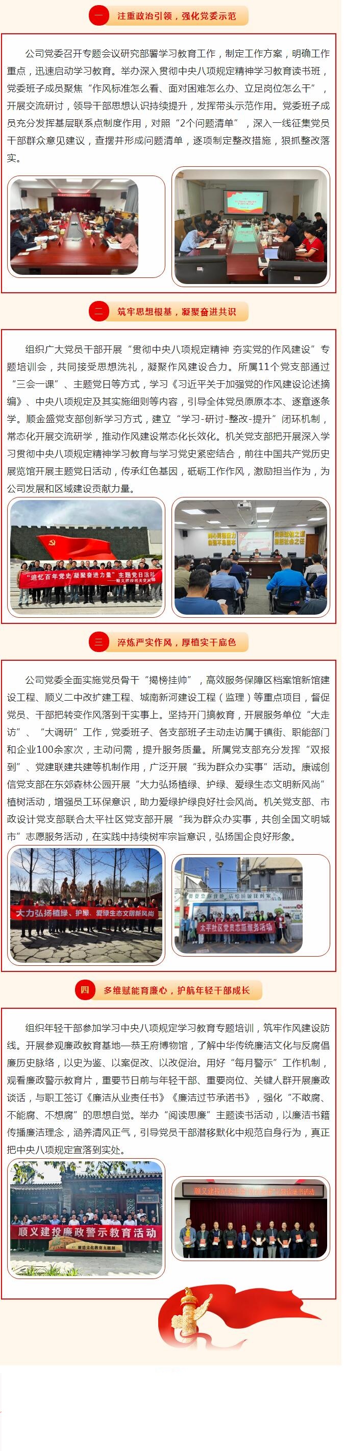 深入貫徹中央八項規(guī)定精神學習教育開展以來,順義建投黨委加強統(tǒng)籌謀劃、細化工作任務、精心組織實施,確保學查改一體推進、融入日常,以作風建設成效推動企業(yè)高質量發(fā)展。